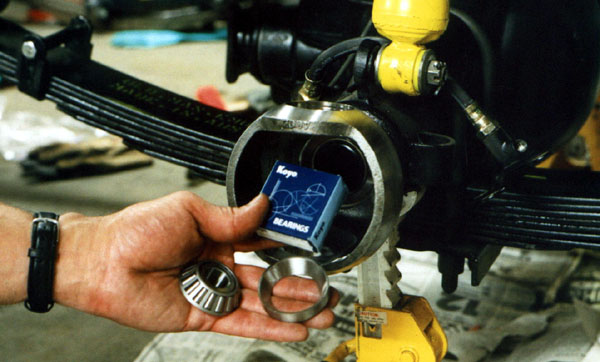 Once the bearings are in place, the knuckle is worked onto the end of the axle housing.