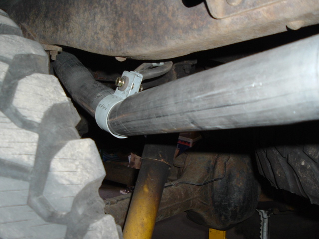 The front hanger didn't line up directly above the pipe, so I used an extra rubber donut, which is normally used on the hanger on an FJ40 which is just after the downpipe. I used some metal strap to clamp the donut to the hanger above and the clamp below.